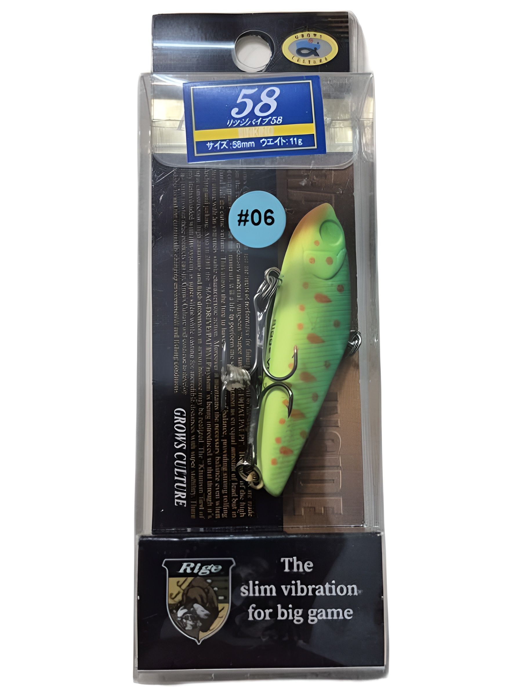 Раттлин GROWS CULTURE RIGGE VIB 58 — универсальная приманка для ловли хищных рыб, таких как форель, окунь, щука и судак. Его масса в 11 грамм обеспечивает глубокое погружение и стабильную игру, идеально подходящую для активного поведения крупной рыбы. Компактная форма и лёгкий вес делают его удобным для транспортировки и длительных рыбацких экспедиций.