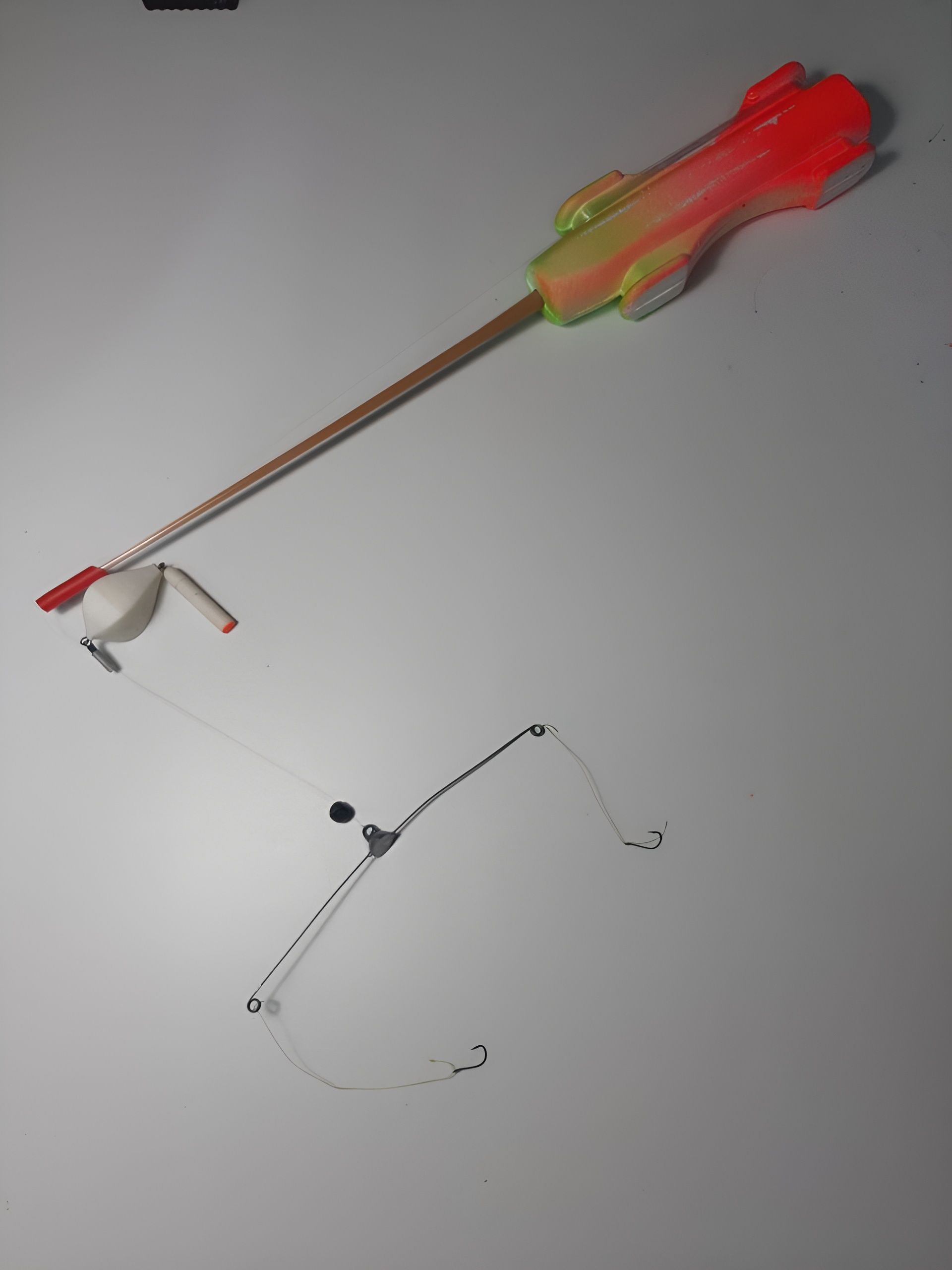 В комплекте леска 0,14-10 метров, поплавок, коромысло, 2 поводка и 2 крючка.